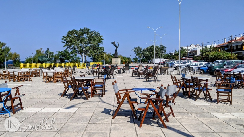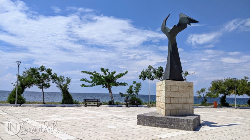 In the square facing the sea, after you leave the port and turn left towards Paleopolis, there is a modern metal statue of the goddess Niki (the famous ancient statue from the Louvre was found on the island of Samothraki and a copy is on display in front of the Archeological Museum).