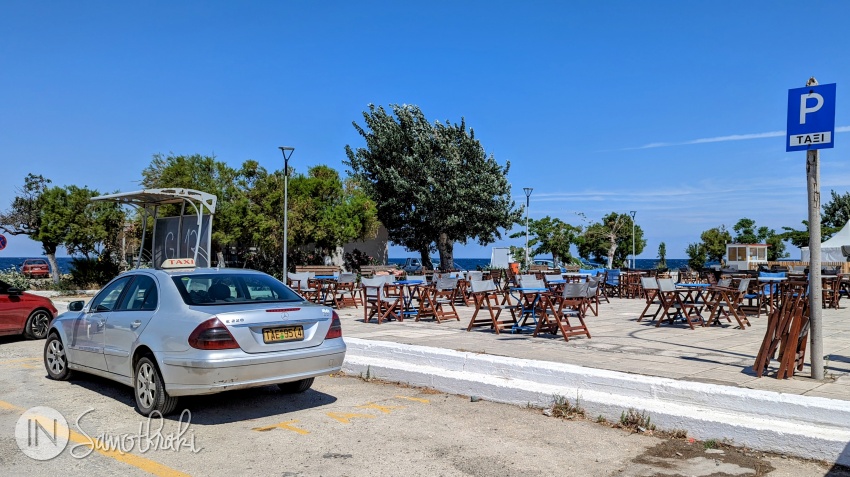 Between the square with the Niki statue and the lighthouse is the Samothraki taxi station.