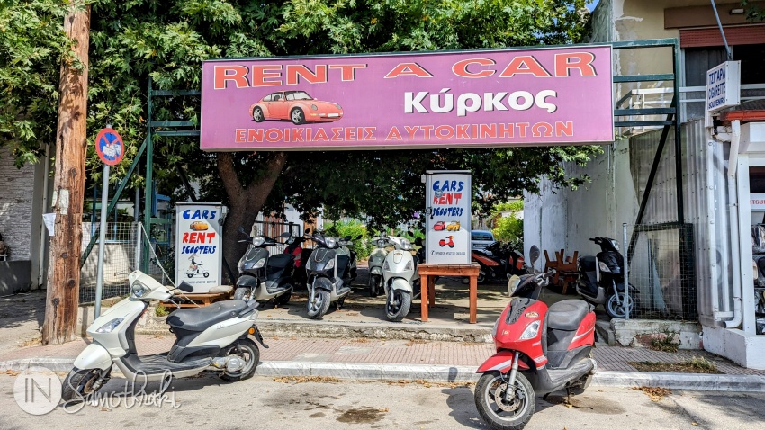 Just as you get off the ferry, on the street parallel to the seafront, you will find car and scooter rental centers.